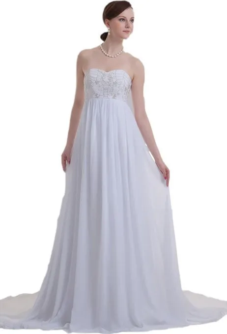 Gorgeous maternity wedding dresses for pregnant brides. Wedding dresses for pregnant brides. When you're a pregnant bride shopping for a wedding dress, timing is everything. Not only will the empire waist highlight the smallest part of your torso, but the nature of the fabric will. Chiffon sheath wedding dress handmade flowers details from onlyforbrides.